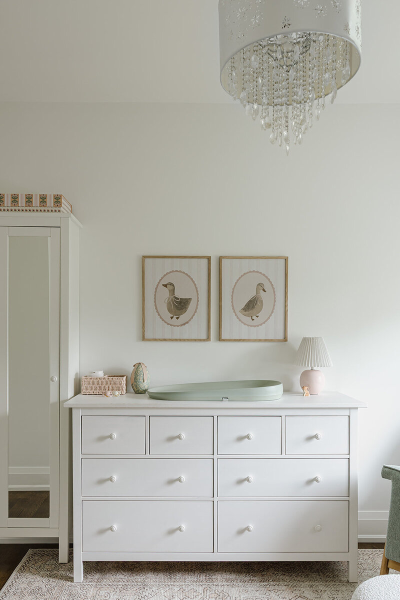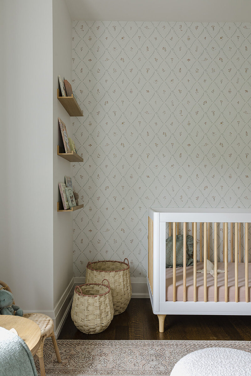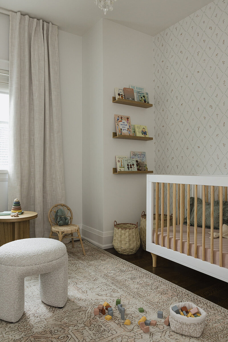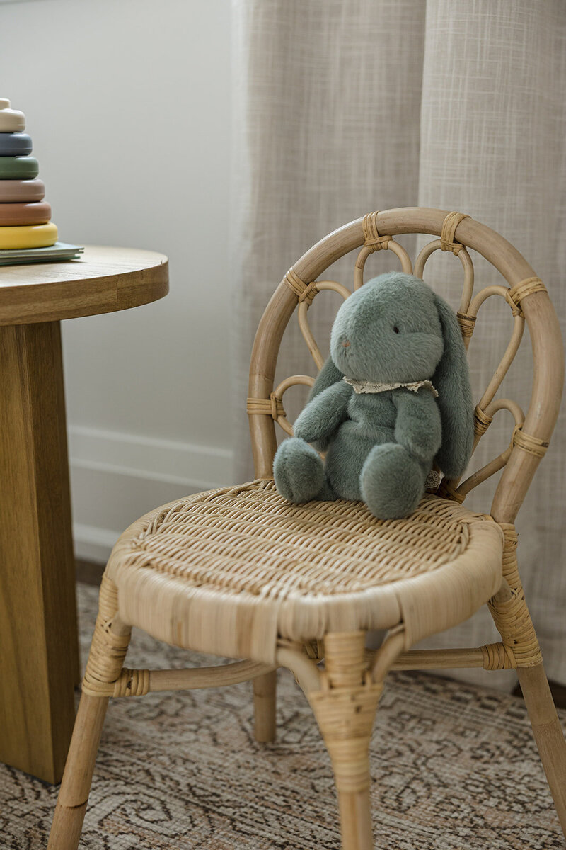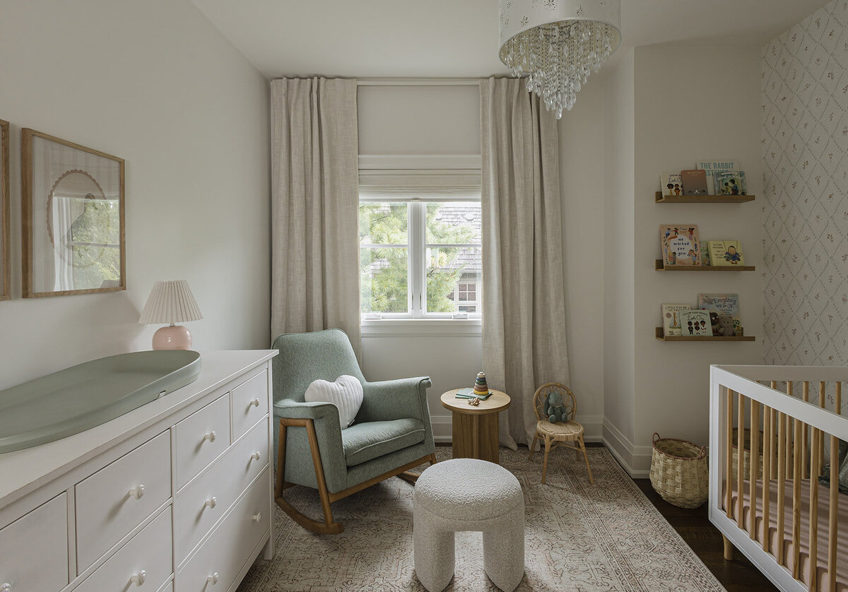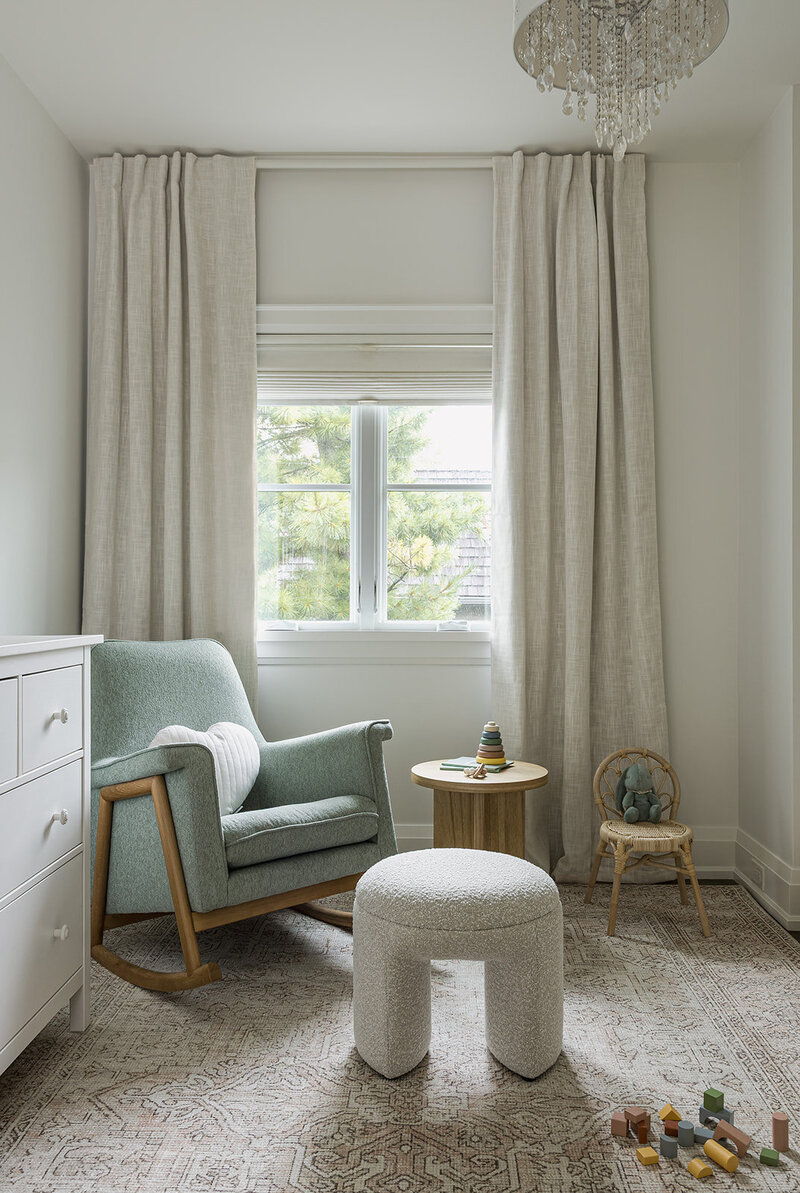 Sometimes an entire room design can be inspired from an existing piece of furniture; in this case we worked with my clients' mint green rocking chair to create a calming and delicate nursery! We added warmth to the room with cozy materials and light wood tones... for a space that's as snuggly as a bunny.